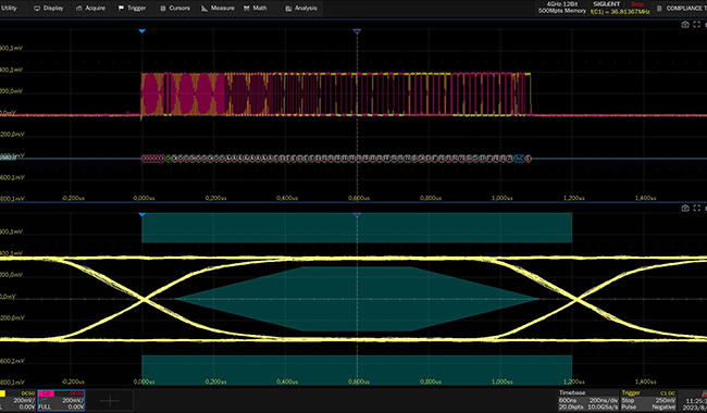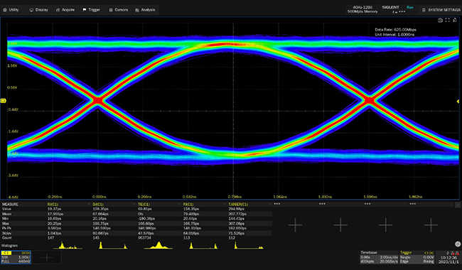 As the core of signal integrity analysis of high-speed systems, eye diagrams characterize high speed communication signals. The quality of the system can be evaluated by observing the influence of inter-symbol crosstalk, noise, and bandwidth. Jitter analysis characterizes the statistical distribution of small timing changes in a systems and is often used to debug digital communication systems and high-speed signal transmission. The SDS7000A series supports automatic parameter measurements for jitter and eye characterization. Easy setup and automatic measurements speed debugging and simplify engineering design testing.